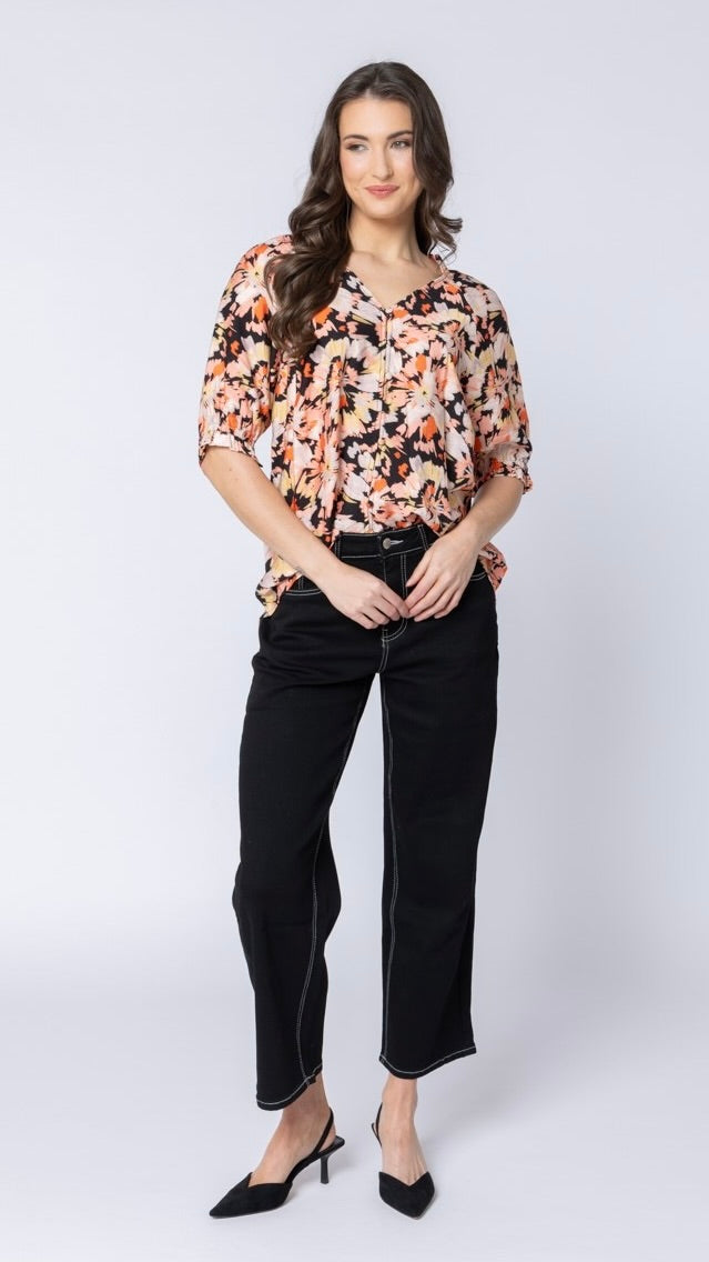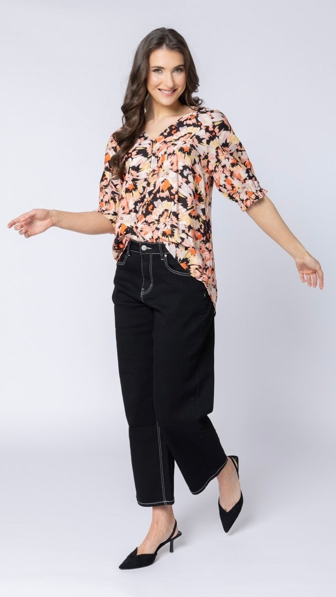 Features Short Sleeves with shirred cuffs, button down front and v neckline.